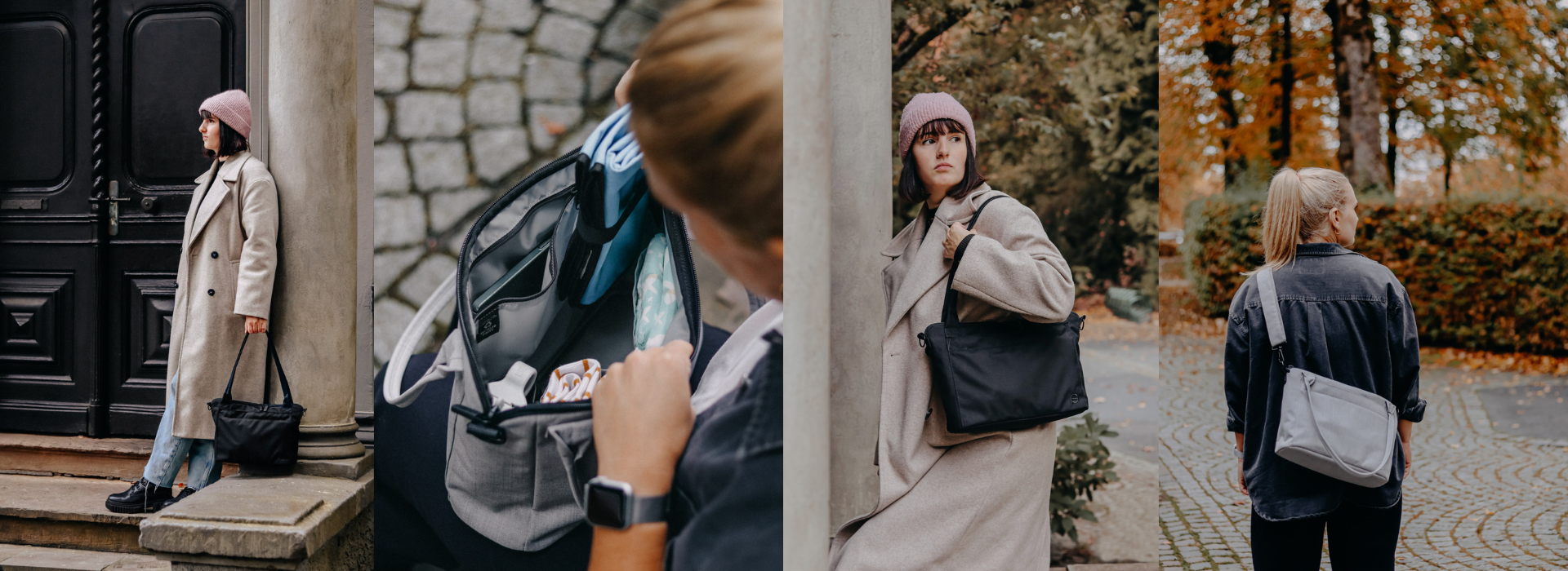 Kinderwagen-Organizer gefüllt mit Windel, Wickelunterlage, Feuchttücher, Schnuller, Snacks, kleiner Trinkflasche (max. 0,5 l), Mulltuch, Portmonee, Handy und Schlüssel.