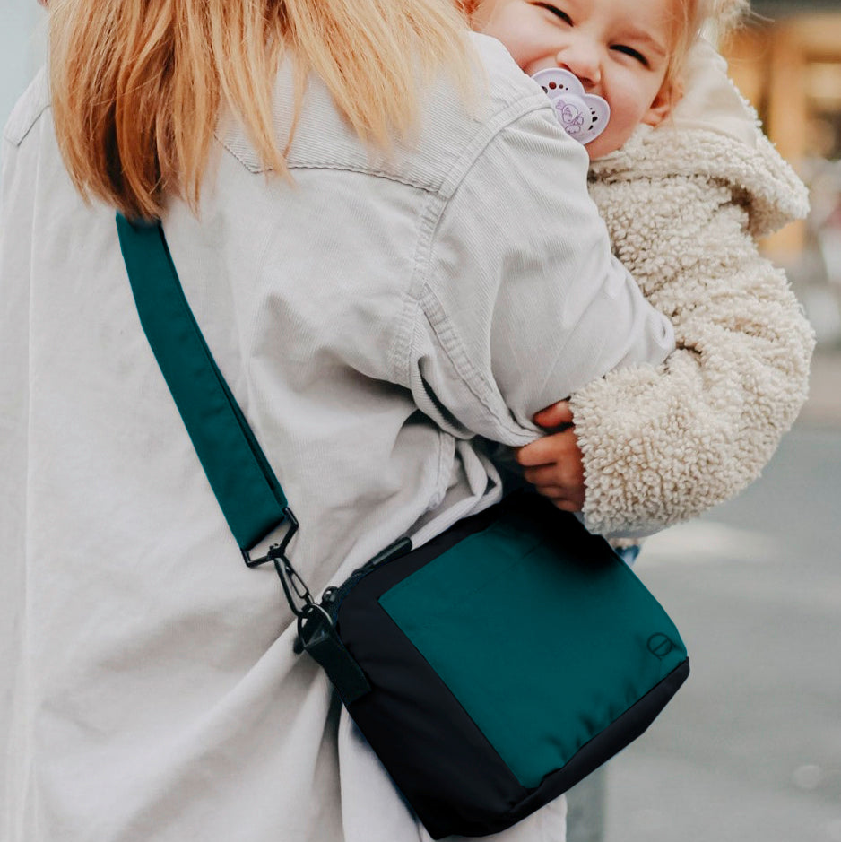 Leni kannst Du als moderne Crossbody bag nutzen, als Umhängetasche oder auch als Kinderwagenorganizer. Die Aufhängung plus einen variablen Gurt bekommst Du mit dazu.